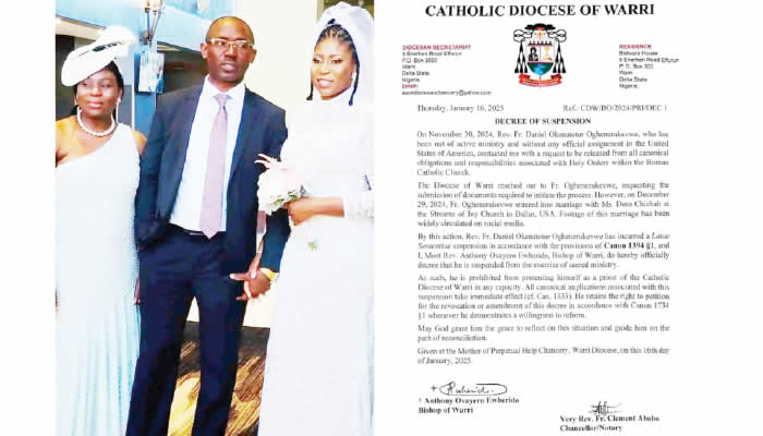 The suspension, which was contained in a statement titled ‘Decree of Suspension,’ dated Thursday, January 16, 2025, jointly signed by the Bishop of Warri, Rt. Rev. Anthony Ewherido, and the Chancellor/Notary, Very Rev. Fr. Clement Abobo, had alleged that “Fr. Oghenerukevwe entered into marriage with Ms. Dora Chichah on December 29, 2024, at the Streams of Joy Church in Dallas, USA.”