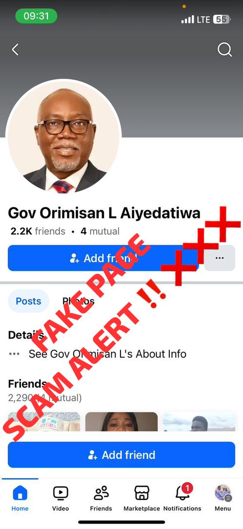 The Ondo State Government has issued a public disclaimer disowning a Facebook page falsely operating under the name “Gov Orimisan L Aiyedatiwa,” warning citizens against engaging with the unauthorized platform.