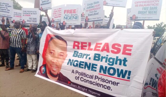 Carrying placards with inscriptions such as “Release Bar. Bright Ngene Now, a Political Prisoner of Conscience” and “NBA, Please Save Our Democracy,” the protesters accused the judiciary of deliberately stalling his appeal.
