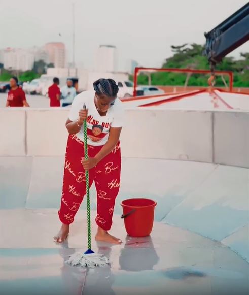 Home»News»Hilda Baci cleans giant pot ahead of record jollof rice cook-off