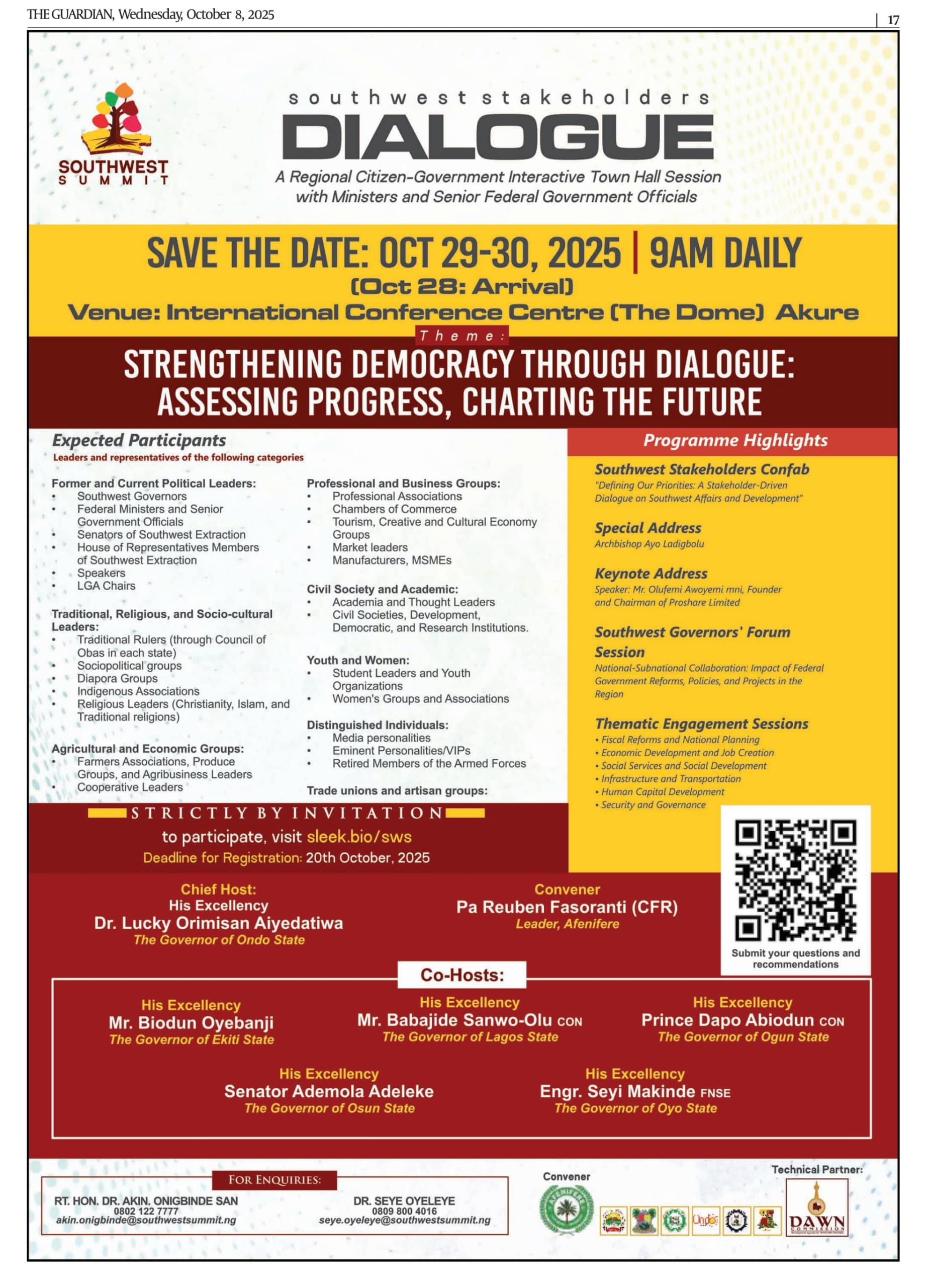 The Ondo State Government, in collaboration with the Development Agenda for Western Nigeria (DAWN) Commission and Afenifere, will host the Federal Government/South West Citizen-Government Engagement Summit on Wednesday and Thursday, October 29-30, 2025.