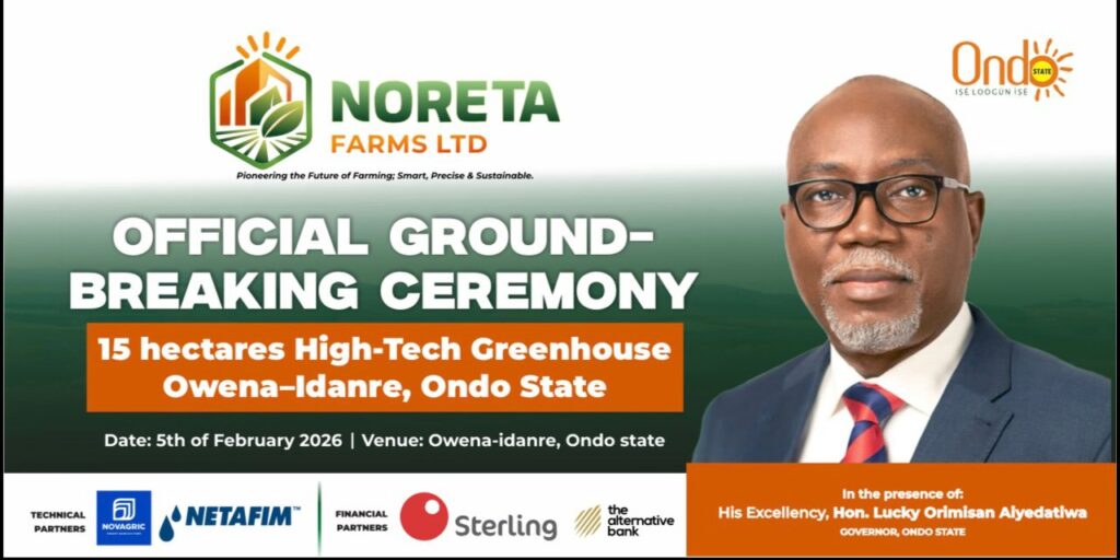 The Senior Special Assistant to the Ondo State Governor on Diaspora Matters, Oluyemi Fasipe, has described the groundbreaking of Noreta Farms’ 15-hectare high-tech greenhouse project in Owena-Idanre as a major milestone in the state’s agricultural and economic development drive.