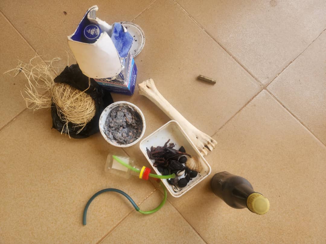 Recovered exhibits include a bone suspected to be human remains, which has been forwarded for forensic analysis, two native sponges, fetish objects, black soap, and an expended shell of AK-47 ammunition.